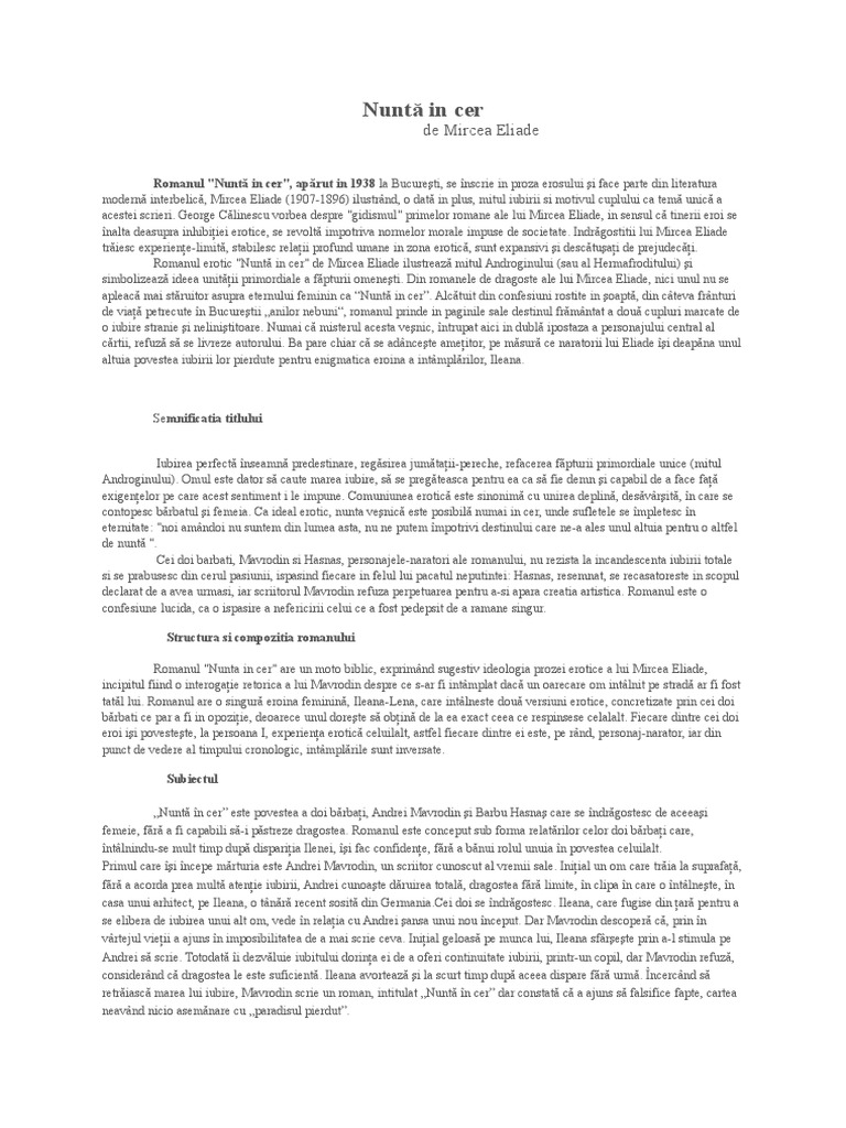 Nunta In Cer De Mircea Eliade Argumentare Roman Modern